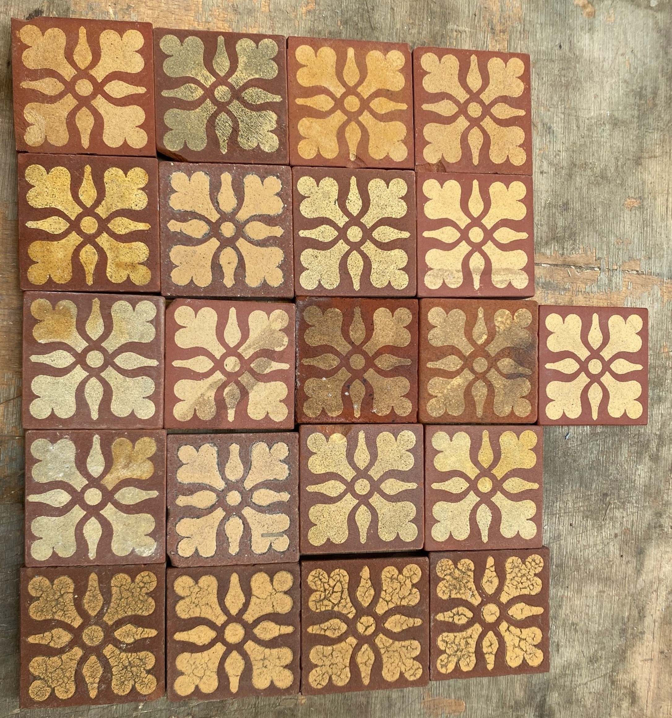 2.25″ encaustic red brown background with buff stock code 2131 , variable quality within the batch these are the best I have currently I have 21 whole tiles and a number in perfectly cut halves . Also have the green version , stock code 2118 and a black on beige version .