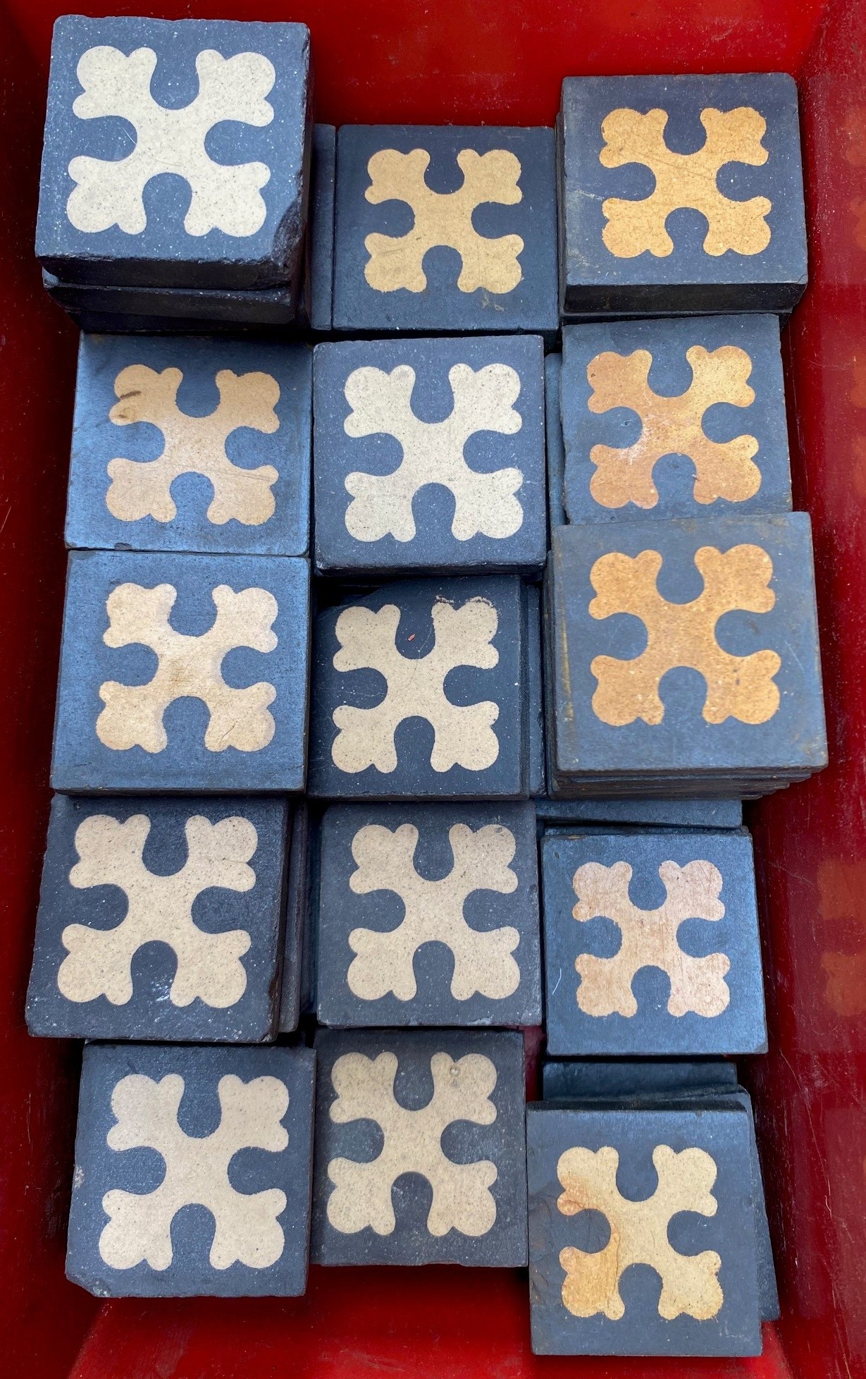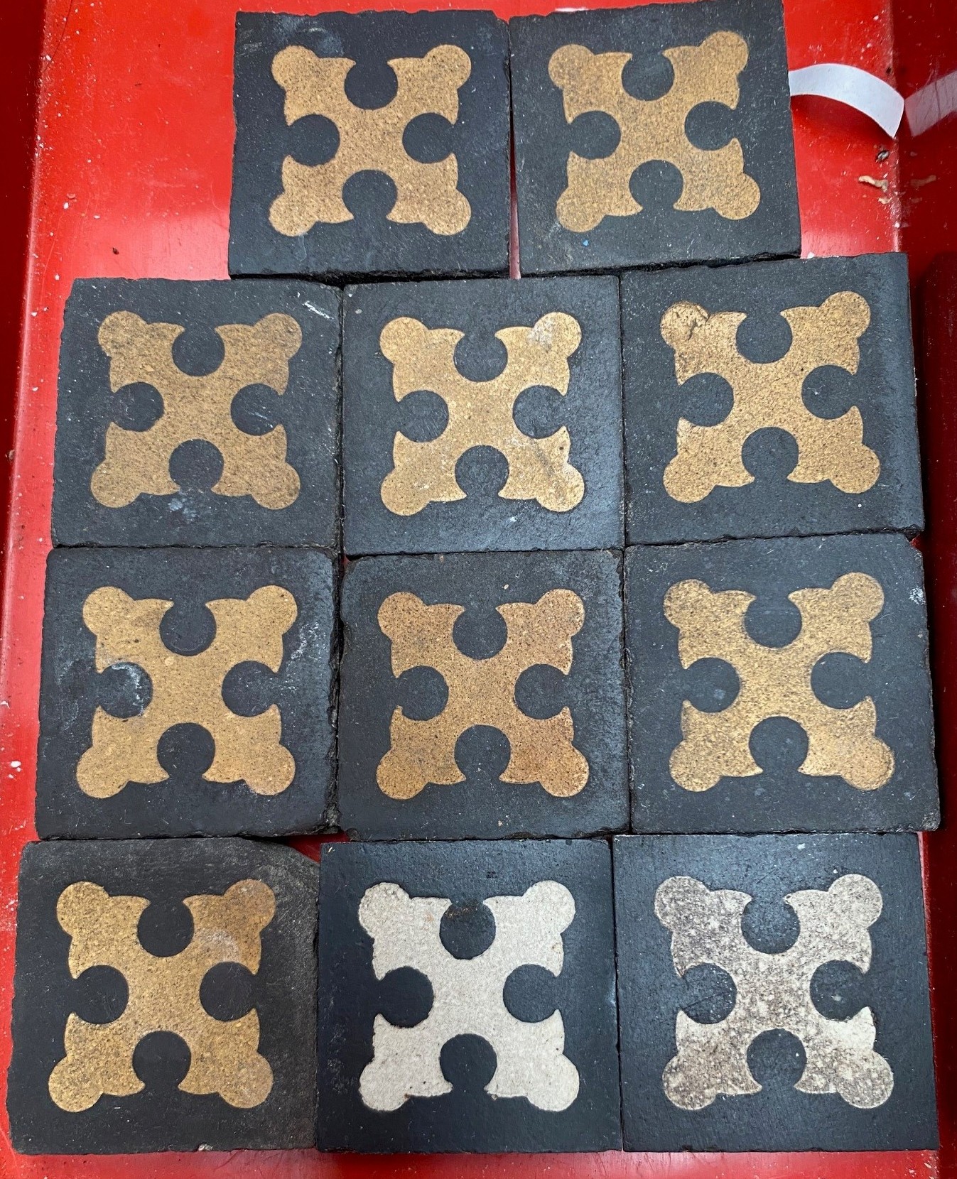 Encaustic 2 ¼” stock code 2105 black background with buff fleur de lys and we have 116 in stock and 11 of the slightly different style . There are colour variation shown in the picture (I have stacked similar colours). Also have damaged tiles in this style which I would sell at a discounted value